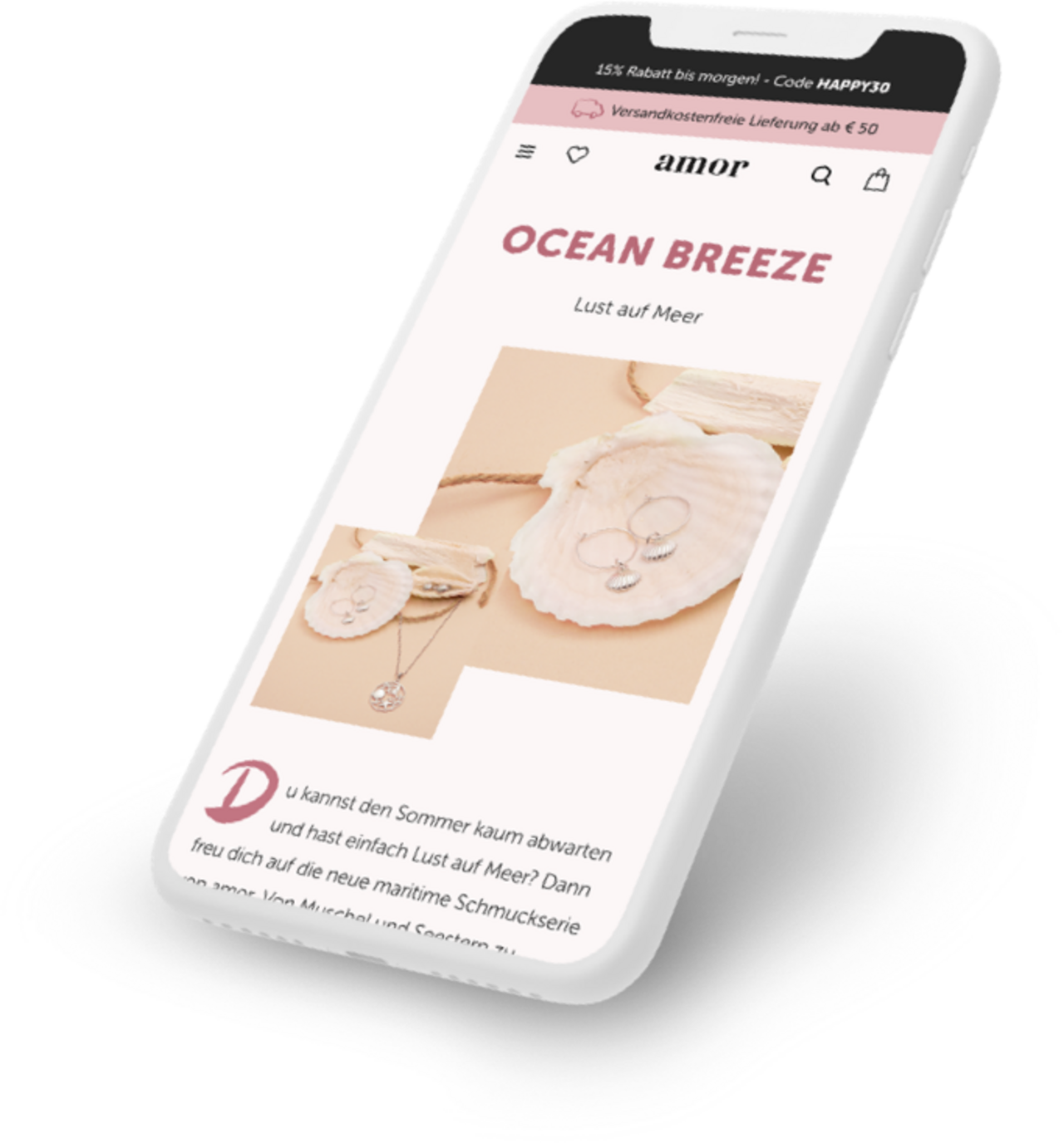 Die Markenbotschaft von AMOR vermittelt sich schon beim ersten Klick dank vieler Designelemente, die harmonisch miteinander verwoben sind und ein vielversprechendes Kundenerlebnis erlauben. Dieses positive Erlebnis gilt vor allem für das wichtigste Verkaufsportal: die mobile Seite von AMOR.de. Mobil First in Spitzenqualität.