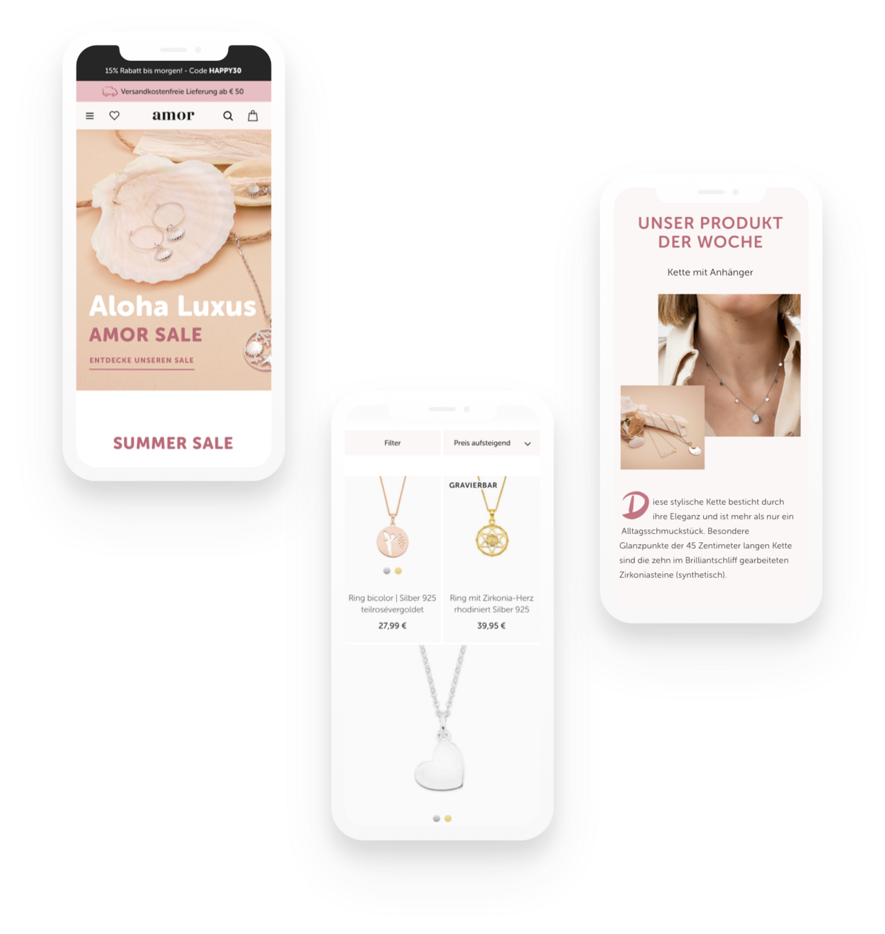 Kategorieseiten und eindeutig gestaltete Filterfunktionen erleichtern es den Besuchern, aus der breit gefächerten Auswahl punktgenau und in Sekundenschnelle die Lieblingsschmuckstücke zu finden und nach Interesse zu clustern. Ergänzende Social-Media-Module tragen die Botschaft der Marke AMOR weiter über die Webseite hinaus in die digitale Erlebniswelt.