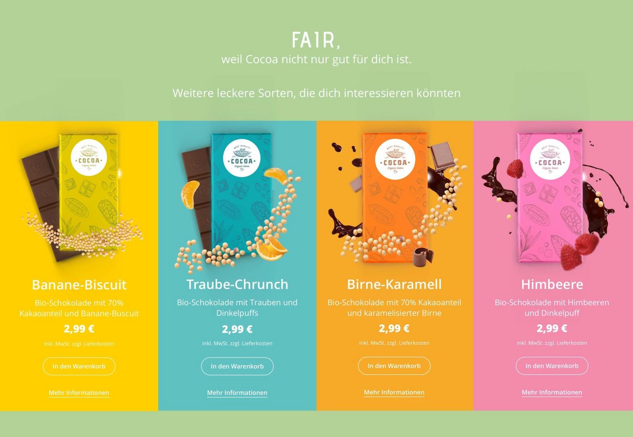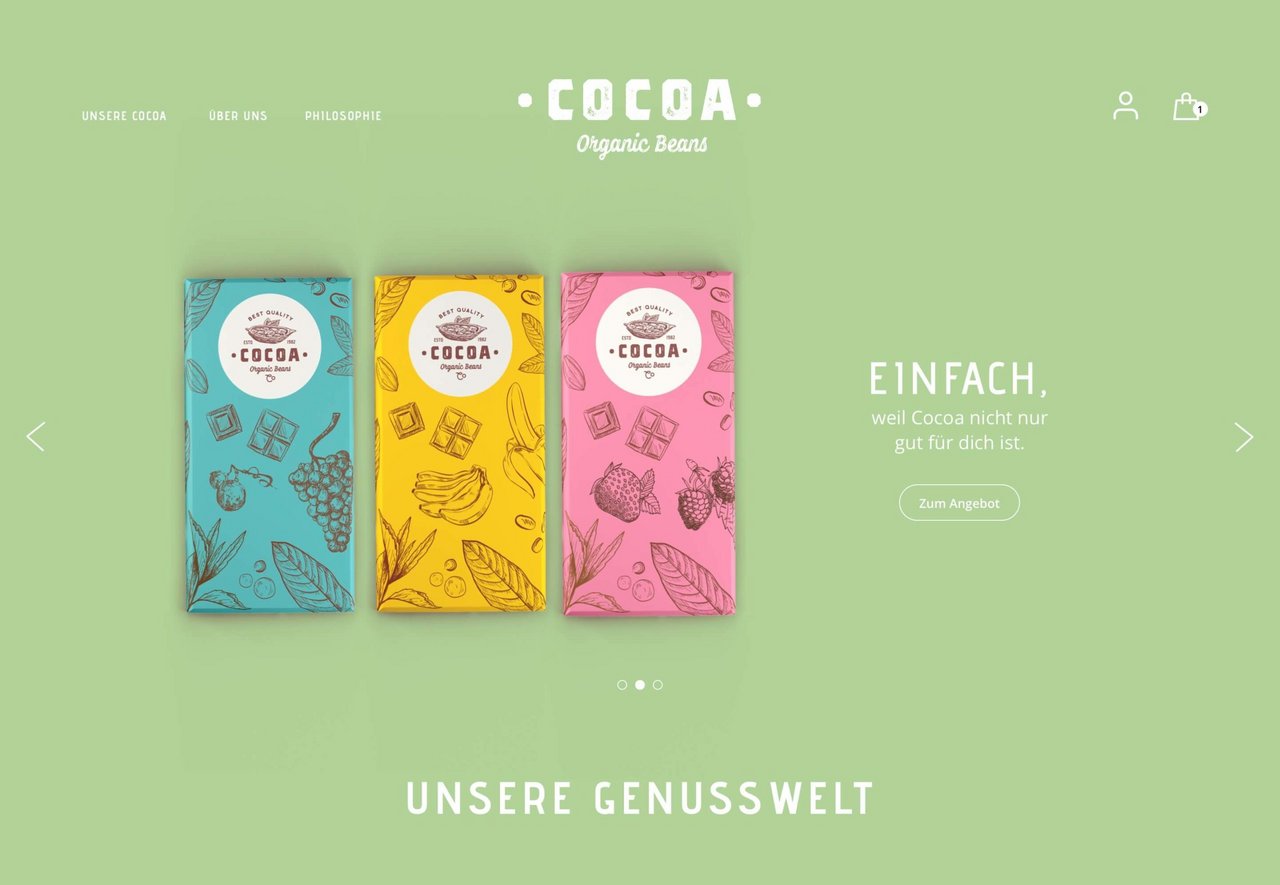 Ein Online-Shop für Genussmittel muss nicht nur die üblichen Anforderungen der Usability erfüllen, sondern vor allem die Sinne ansprechen. Das Geschmackserlebnis soll über visuelle Botschaften greifbar werden. Das Aroma soll sich im Design entfalten und spürbar werden. Die Geschmäcker sind verschieden, doch Cocoa soll die Geschmacksknospen von jedem Besucher anregen und zum Kauf anregen.
