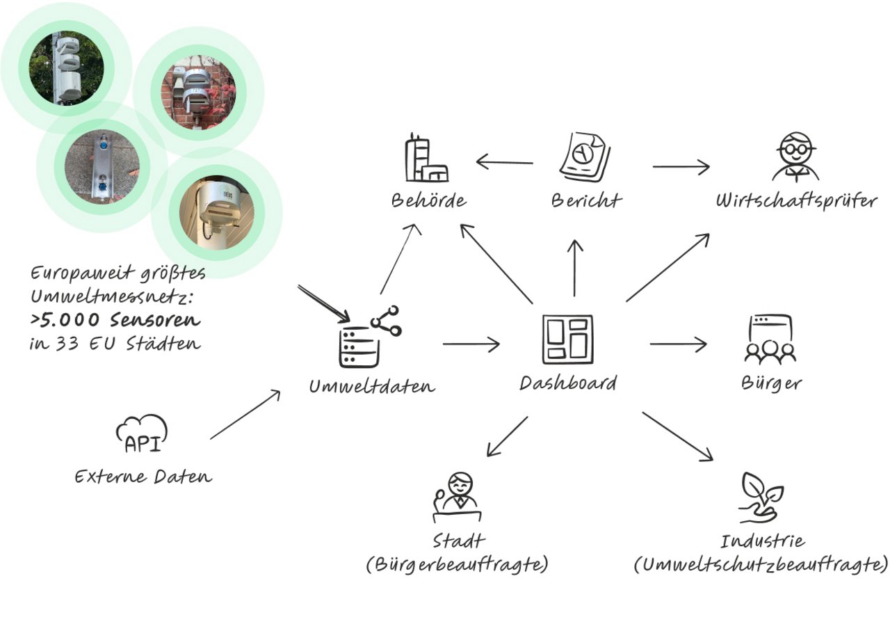 Die Basis bilden Echtzeitdaten aus nahezu einhundert modularen und festen Stationen aus den Regionen Teltow und Halberstadt zzgl. 80 mobilen Sensoren auf Bussen, Straßenbahnen und PPP Partner wie McDonald. Ziel ist es, eine schnelle und einfache Emissions- und Verkehrsanalyse und -überwachung zu ermöglichen, um langfristig zu einer nachhaltigen und umweltverträglichen Raum- und Stadtplanung beizutragen.