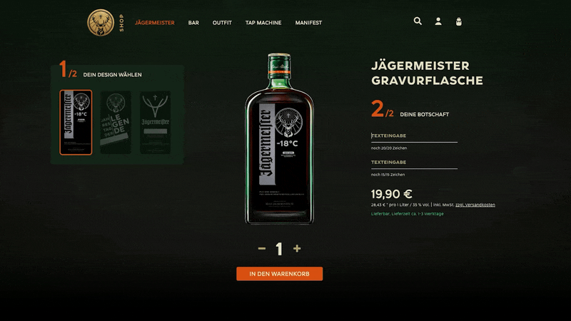 Mit der engen Integration des Produktmanagements in unserem Designprozess entstand in Teamarbeit ein technisch und gestalterisch außergewöhnlicher Online-Shop. Wir unterstützen Jägermeister auch weiterhin, die Besonderheiten der Marke online erlebbar zu machen.