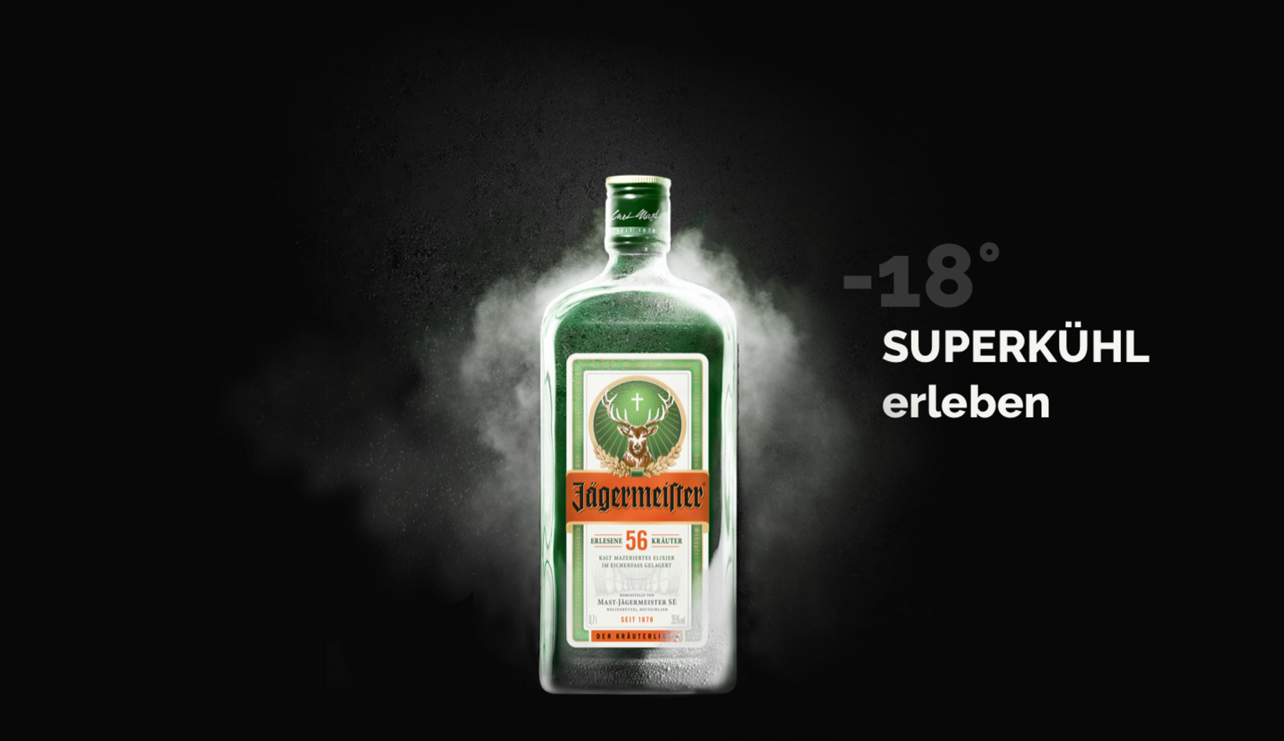Die ikonische Jägermeister-Flasche ist der Star. Unser Ziel war die selbstbewusste Präsentation dieser Ikone in Verbindung mit Elementen des Bauhausstils, maßvoll aufgebrochen durch wechselnde Text- und Bildkompositionen. Eine technische und gestalterische Herausforderung.