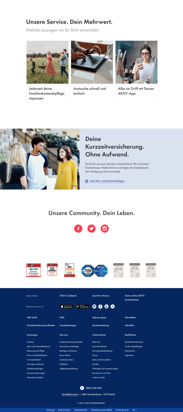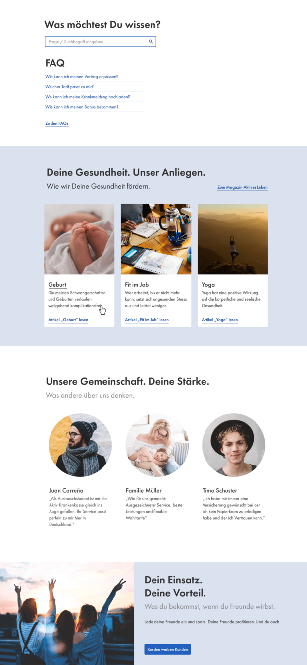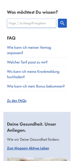 Mit all den Optionen, die den Nutzern verschiedene Einstiegsmöglichkeiten auf der Website eröffnen, um gewinnende Begeisterung zu schaffen, legen wir den Grundstein für eine neue Generation der Krankenkasse. Die Gesundheitsbranche befindet sich im stetigen Wandel und das bedeutet zuvorderst Flexibilität. Diese drückt sich elementar in unserer Modularität aus, die ein zukunftssicheres Auftreten bietet, das sich auch an alle zukünftigen Eventualitäten anpasst.