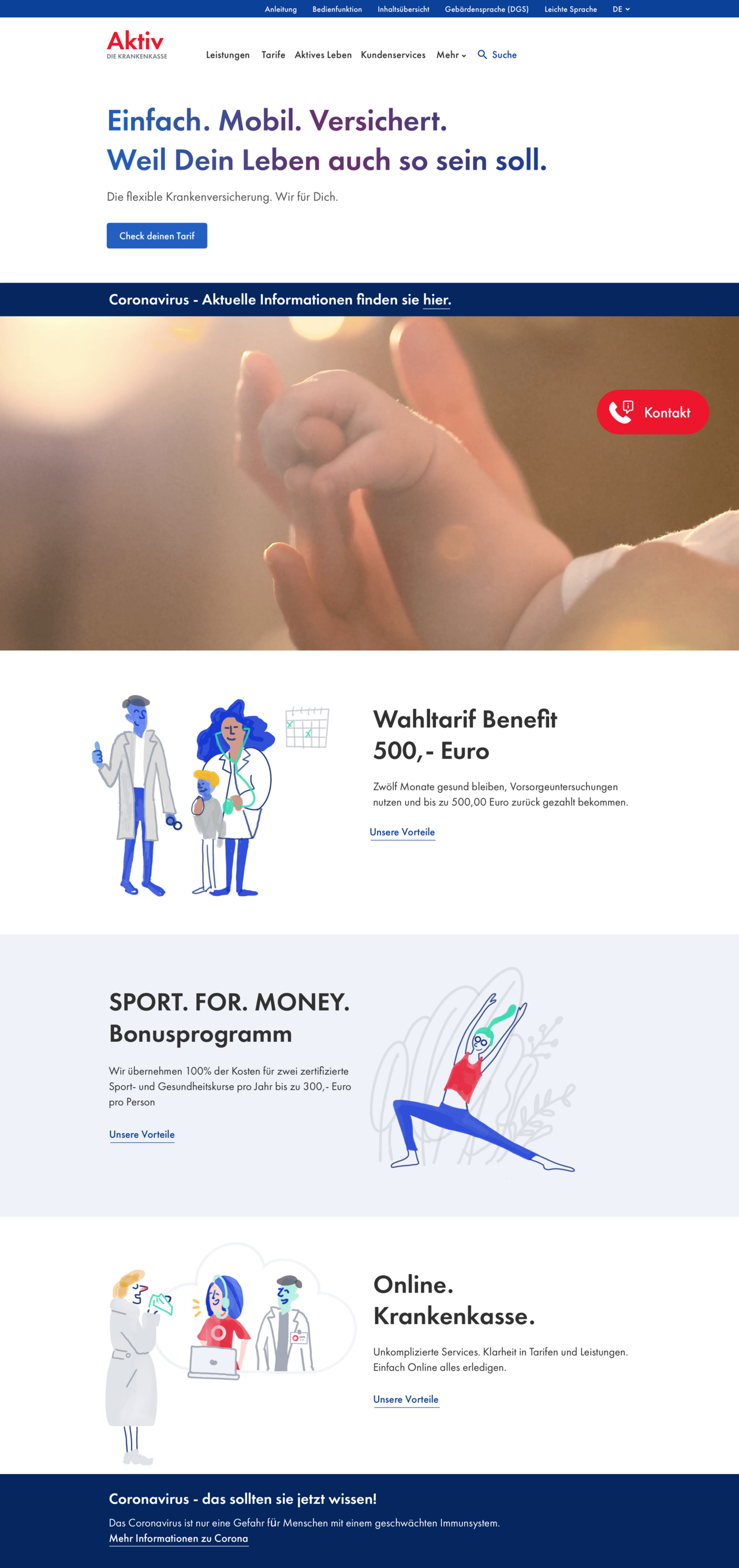 Für uns sind Illustrationen ein wichtiger Bestandteil des Visual Designs. Illustrationen können eine eigene Sprache sprechen, müssen aber exakt auf den Kunden abgestimmt werden. Im Fall der Aktiv Krankenkasse sind Illustrationen ein wichtige visuelle Ergänzung der Inhalte.