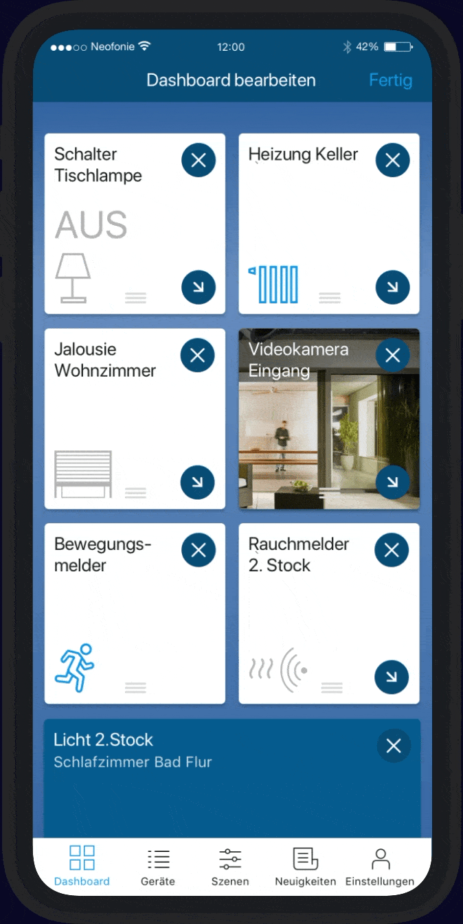 Wir haben das Dashboard zum ersten und zentralen Bildschirm der RADEMACHER-App gemacht. Es bietet einen schnellen Überblick über alle vernetzten Geräte und kann personalisiert werden.